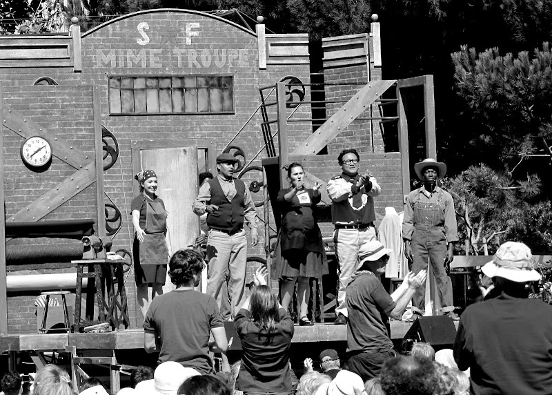 | наблюдала сегодня очень странное действо в нашей йерба буене гарденс: передвижной революцыонный театр (!) показывавший пиесу о борьбе рабочих мириканской ткацкой фабрики за свои права против злодеев капиталистов (причём в конце пиесы рабочие проиграли, преданные плохишом и капиталисты всё обратно захватили и всё стало как было) несмотря на даже некоторое наличие остроумных замечаний о современной американской жизне - пьеса такой чистый беспримесный троцкизм причём при словах, что капитализм в конце концов падёт сидящая в принесённых с собой раскладных креслах цивилизованная на вид публика радостно и долго апплодировала ------------------------ театр этот вроде бы существует лет 50 и капитализм тут давно уже пал просто они этого кажетцо не заметили